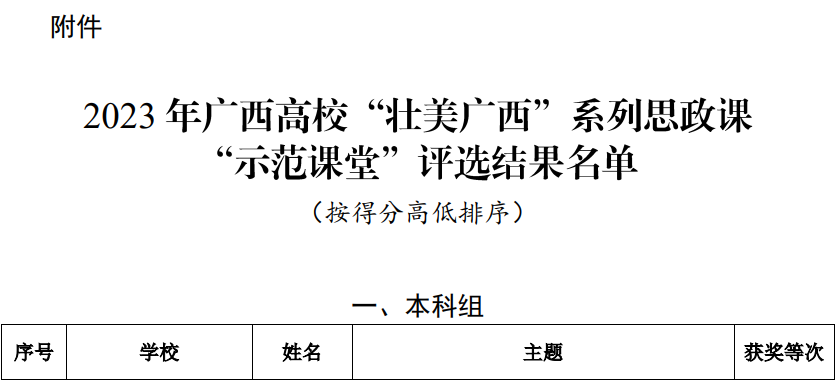 近日,自治区教育厅公布了2023年广西高校“壮美广西”系列思政课“示范课堂”评选结果名单,williamhill威廉希尔推荐的4名参赛教师全部获奖,其中一等奖1项、二等奖2项、三等奖1项。