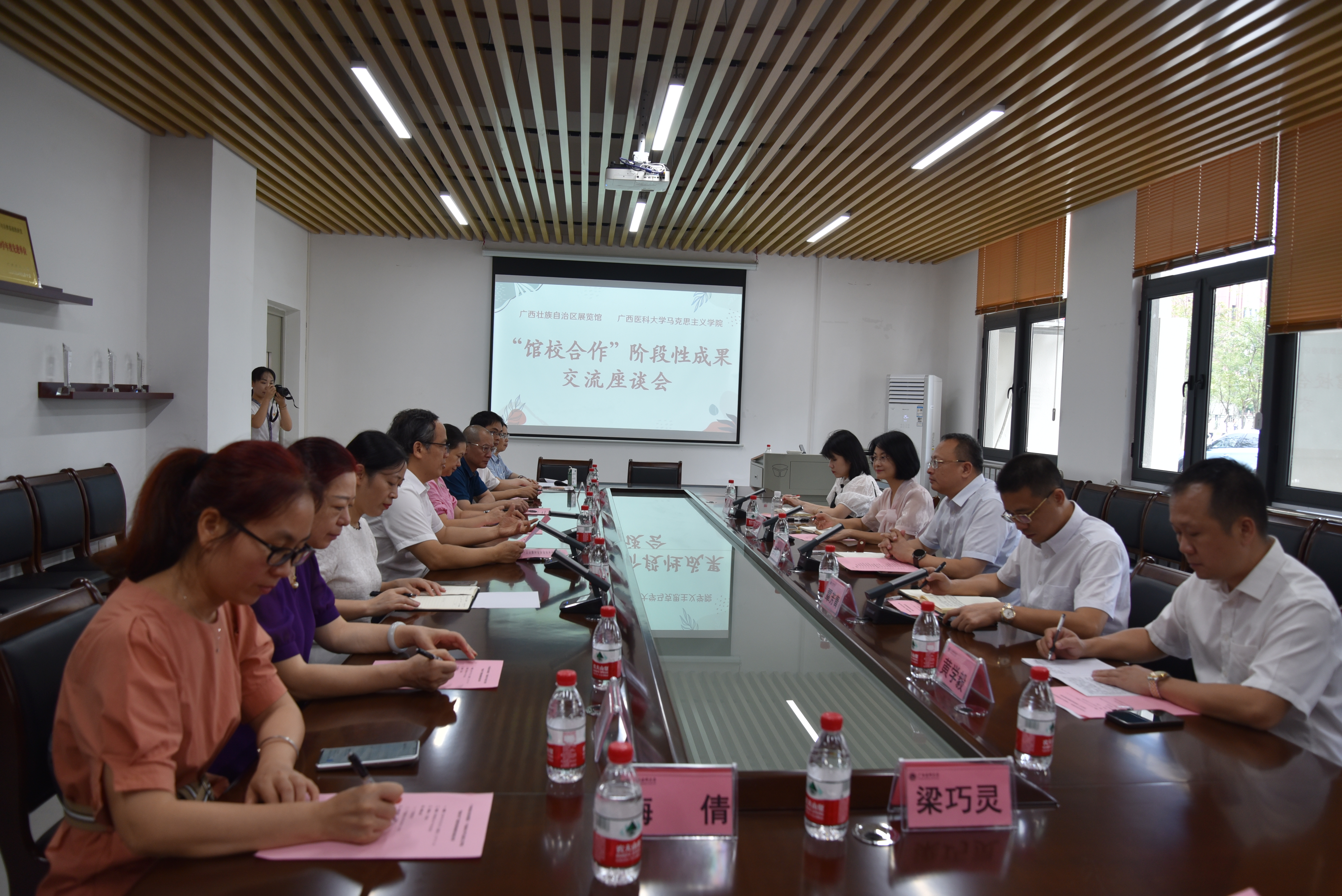 在博雅楼一楼会议室召开的“馆校共建”阶段性成果交流会上,王前强首先对广西展览馆馆长李忠权一行的到来表示热烈欢迎,并就进一步深化“馆校合作”做了讲话。李忠权在对广西展览馆推动“馆校合作”工作情况做总体介绍的同时,对如何深化与公司的合作做了讲话。随后,双方围绕青年志愿者培养、课题及相关比赛的双向共赢等开展交流讨论,并在老员工宣讲能力培养、课程开发与合作、联合申报课题、智库建设等方面达成初步共识,进一步拓展了双方的合作思路,为深化馆校合作注入新动能。