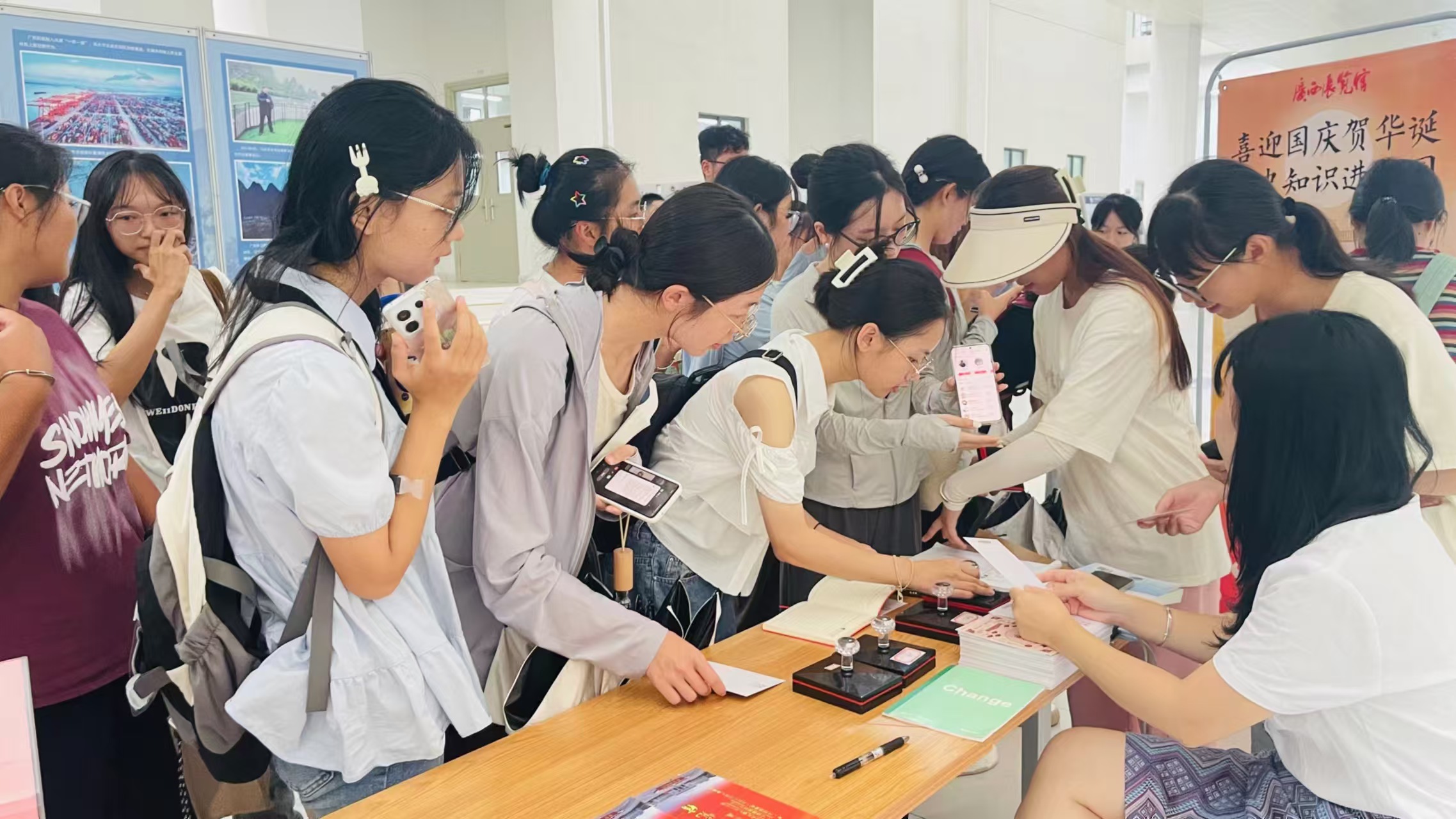 在武鸣校区A1教学楼一楼组织开展的“中国共产党广西历史展览”“广西脱贫攻坚成就展”“‘奋进新时代’主题成果成就展广西单元”三大主题展览微宣讲、党史知识问答以及印章打卡活动,让同学们切身感受到中国共产党成立以来带领中国人民不懈奋斗的曲折历程和取得的辉煌成就,激发了同学们的爱国情怀和责任意识。